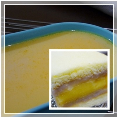 3.布丁切片後鋪在其中 一片的蛋糕上。